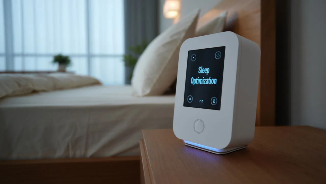 A bedside device that monitors room air quality and sound, adjusting white noise and humidification/dehumidification automatically for optimal sleep.