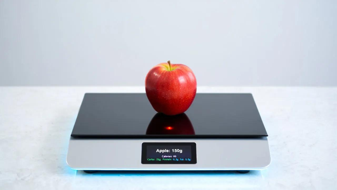 A kitchen scale that integrates with an app and uses a near-infrared sensor to estimate the caloric and macronutrient content of food placed on it.
