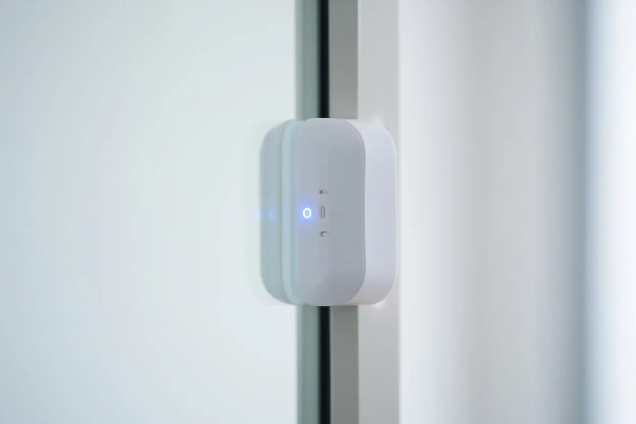 A small sensor that attaches to a window frame and uses frequency analysis to distinguish between a natural noise and the specific sound of glass breaking.